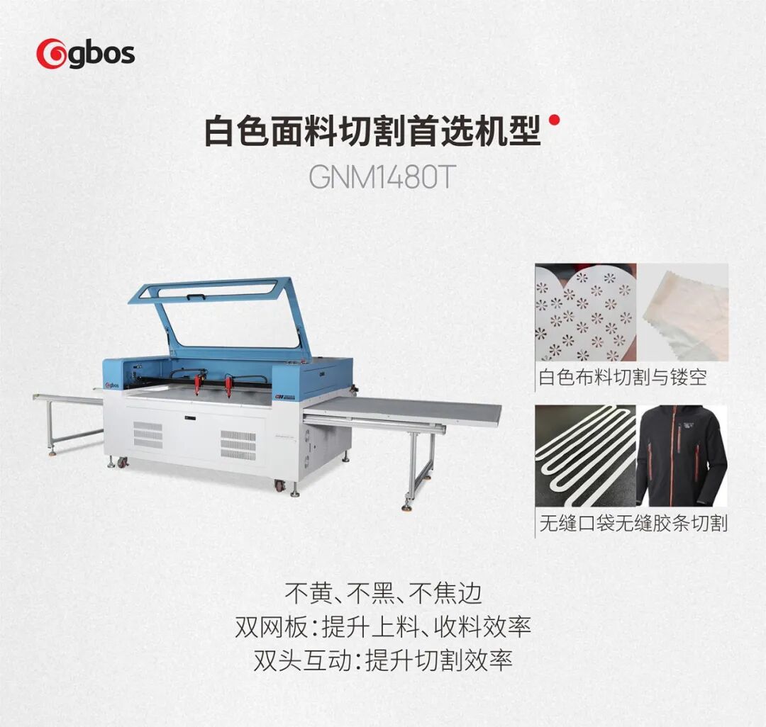 光博士雙網(wǎng)板左右互動(dòng)激光切割機(jī)GNM1480T的出現(xiàn),用技術(shù)創(chuàng)新打破僵局,成為白色面料切割的最優(yōu)解。