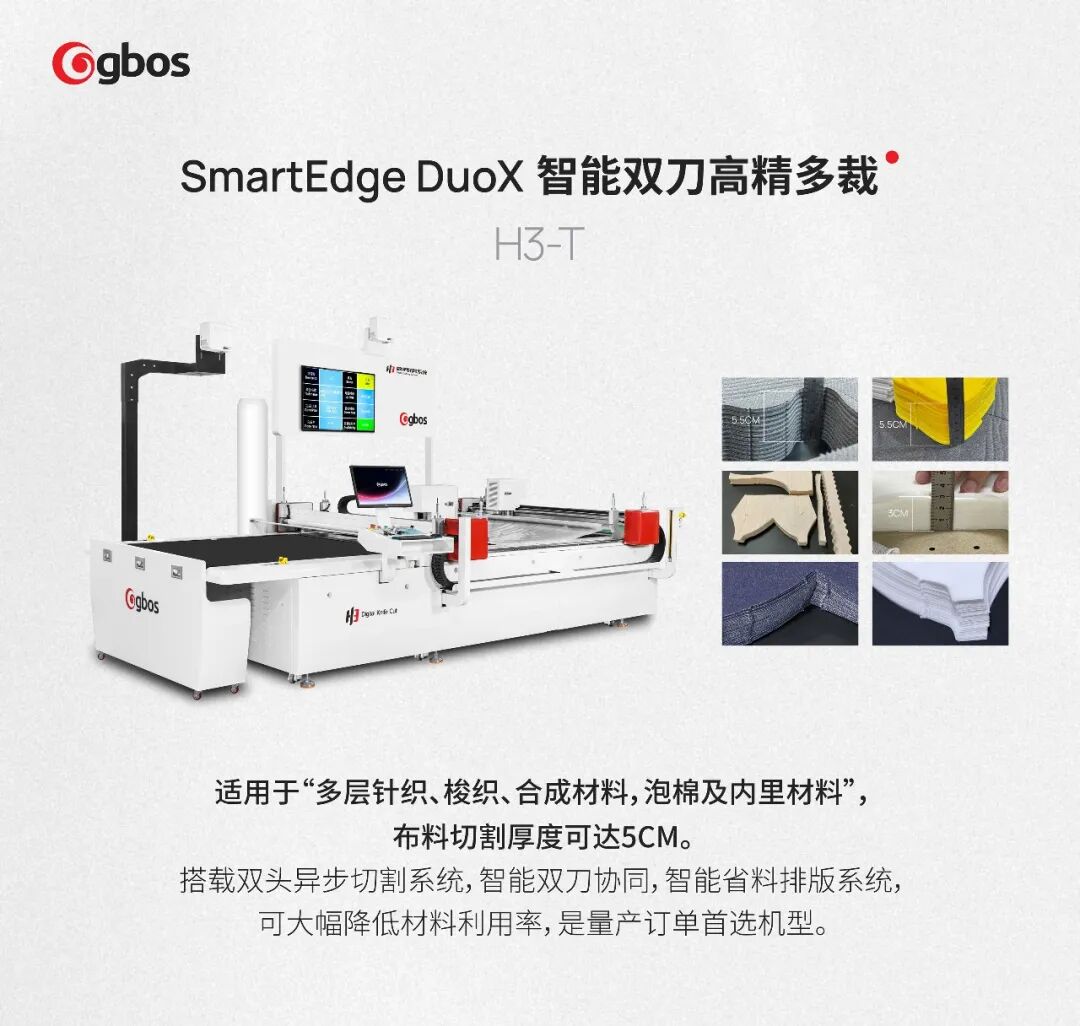相較于傳統(tǒng)單刀切割,H3-T可完成高層、多層材料的高精度同步切割,適配多樣化面料與工藝需求,在提升切割精度的同時(shí)進(jìn)一步降低材料損耗,為企業(yè)帶來(lái)更高的生產(chǎn)效益。